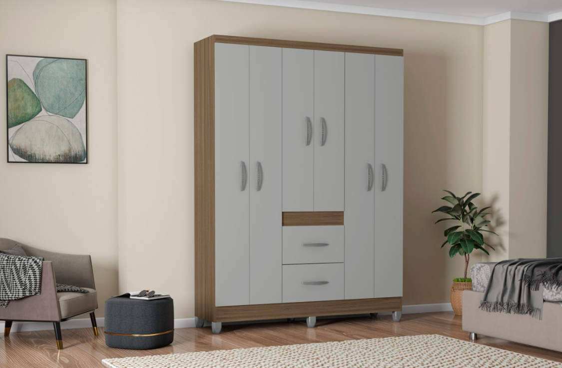 Com 1,35m de largura, o Milão oferece excelente aproveitamento interno com 6 portas e 2 gavetas, garantindo espaço bem distribuído para roupas e acessórios.
